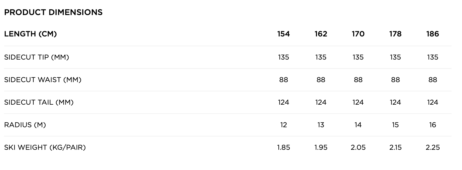 - Sidecut: 135-88-124 mm.